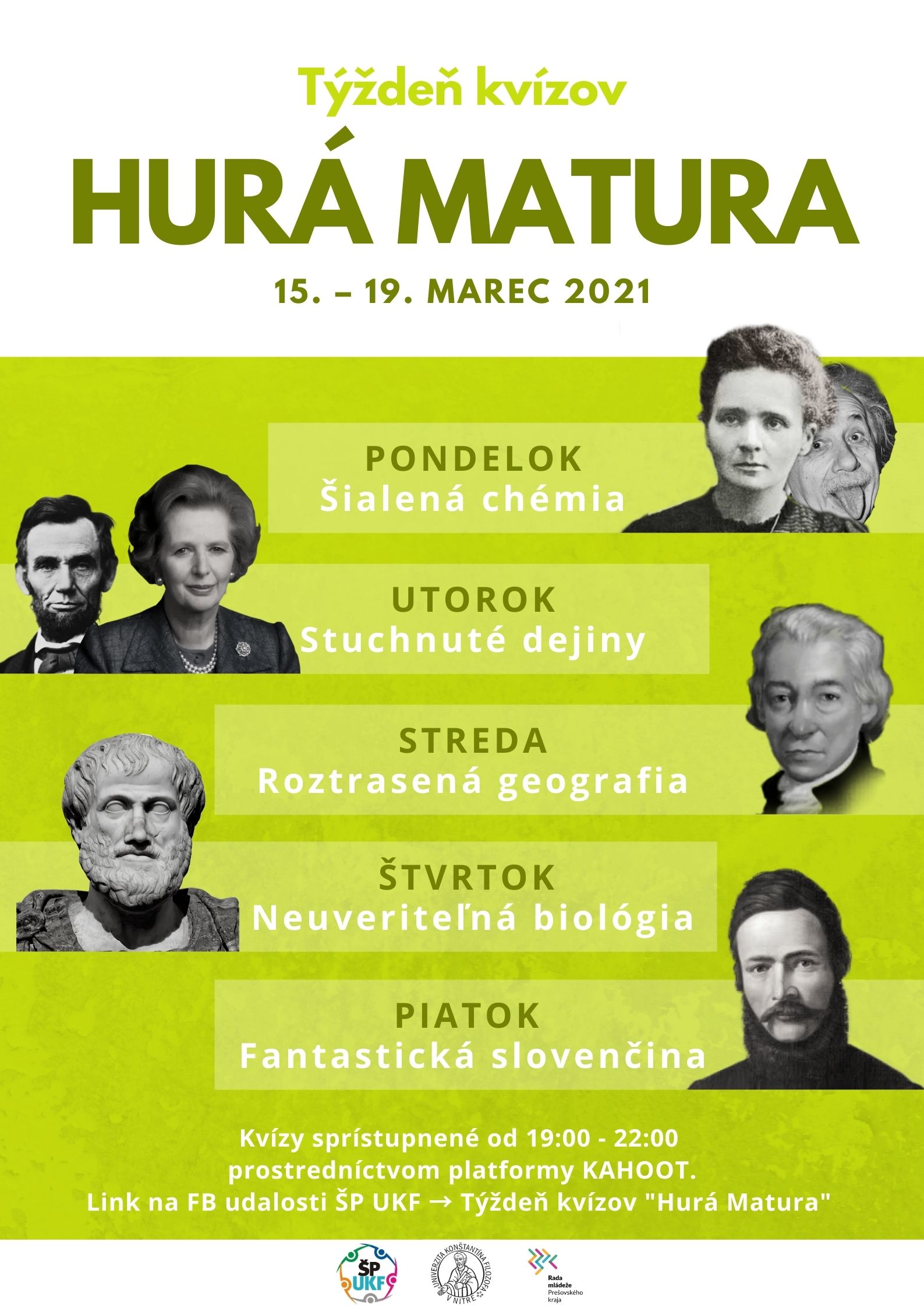 Kvízy budú prebiehať online cez platformu Kahoot. Kód na Kahoot aj link budú zverejnené v udalosti na facebookovom profile Študentského parlamentu UKF.