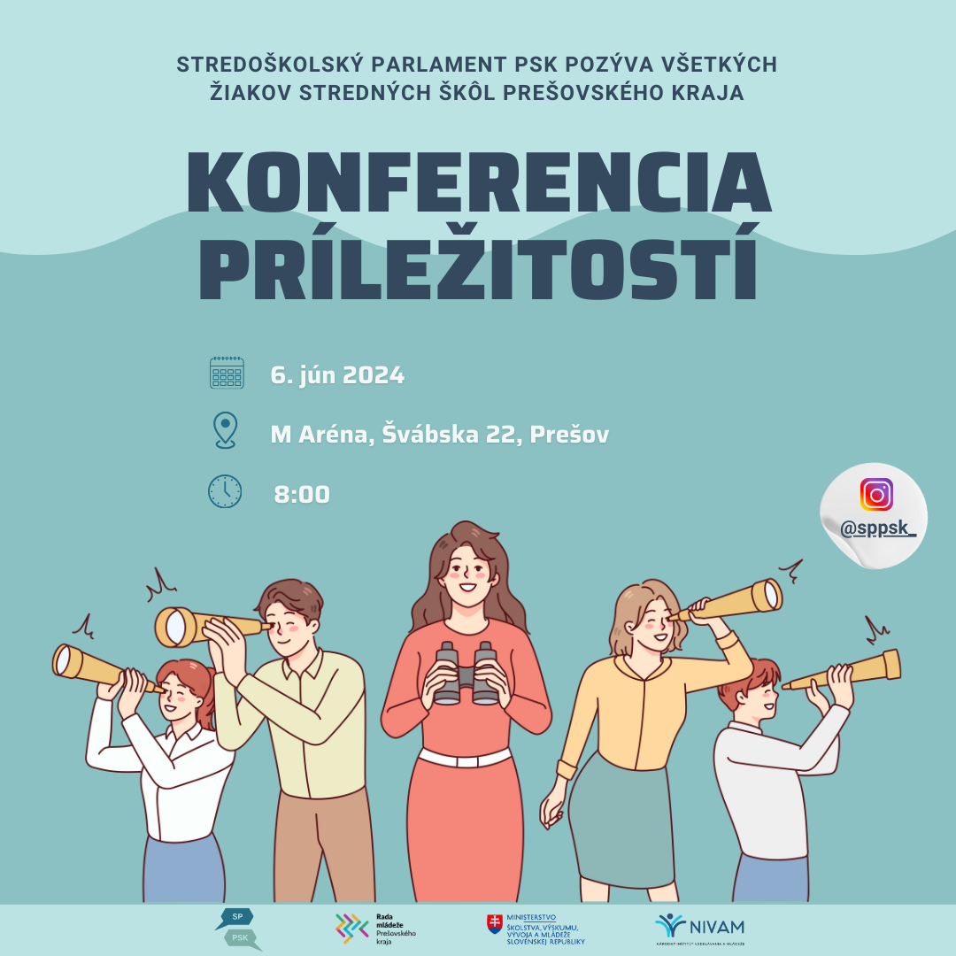 Stredoškolského parlamentu Prešovského samosprávneho kraja v spolupráci s RMPK pozýva žiakov stredných škôl a pedagógov z Prešovského kraja na konferenciu, ktorej cieľom je zvýšiť informovanosť žiakov stredných škôl o ich právach a mimoškolských aktivitách zameraných na ich rozvoj.
