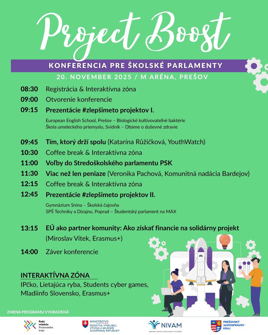 Téma konferencie: Project boost - Ako rozvíjať tím a posunúť nápad na ďalšiu úroveň? Ako vytvoriť dôveru, motiváciu a zdravú vnútornú kultúru tímu? Ako zosúladiť ciele projektu s osobnými hodnotami členov tímu? Ako efektívne komunikovať počas náročných fáz projektu? Kde získať financie na náš nápad? Čo je crowdfunding a ako ho využiť?