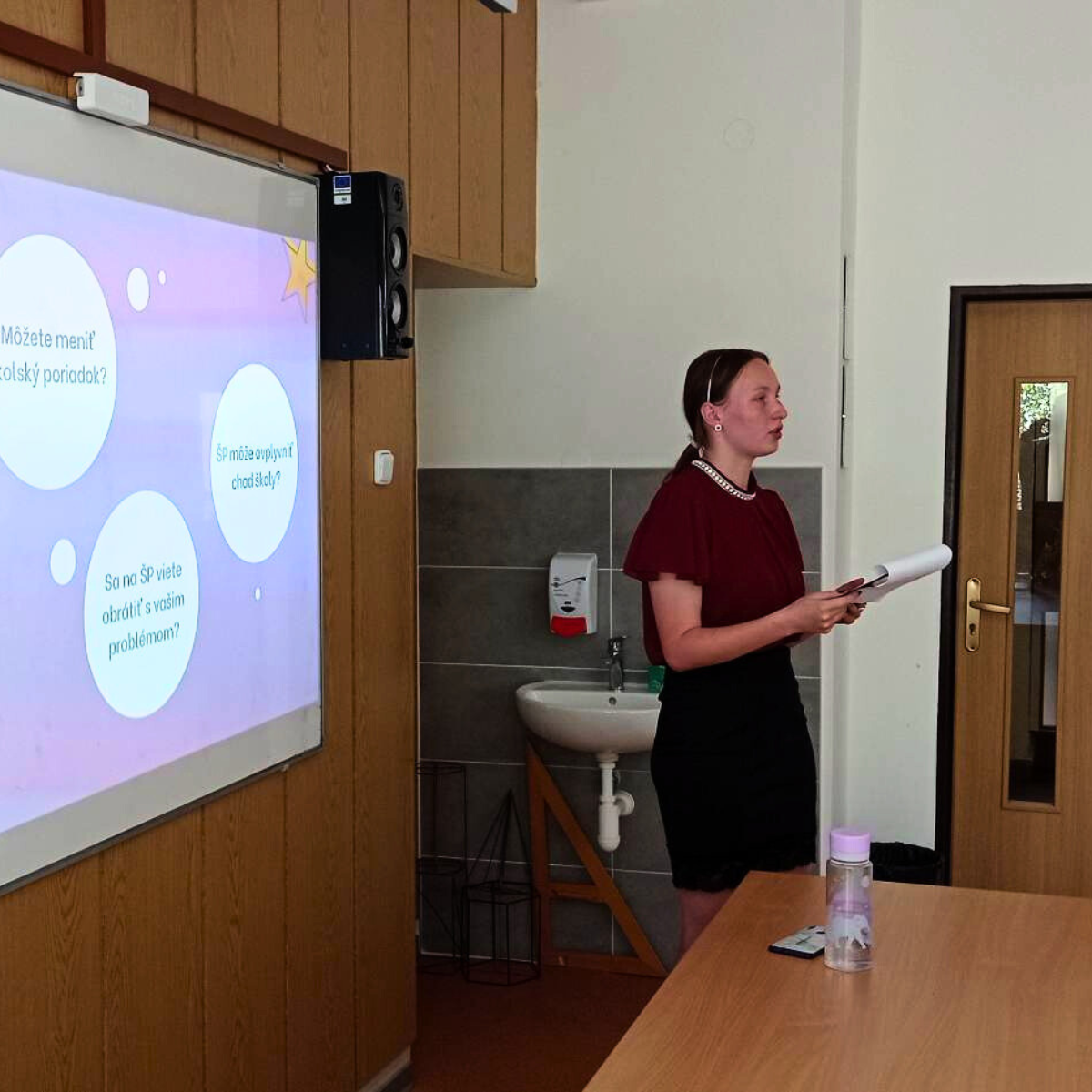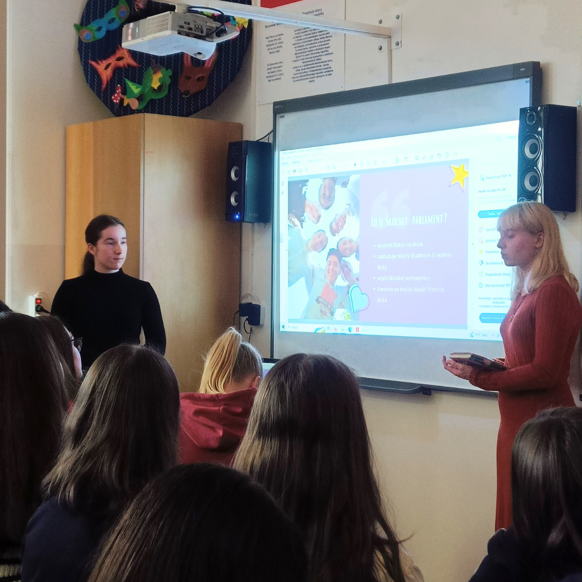 Členovia SP PSK si pripravili prezentáciu o tom, čo školský parlament je, aké má právomoci, spomenuli taktiež príklady dobrej praxe a čo všetko sa už stredoškolskému parlamentu na škole podarilo.